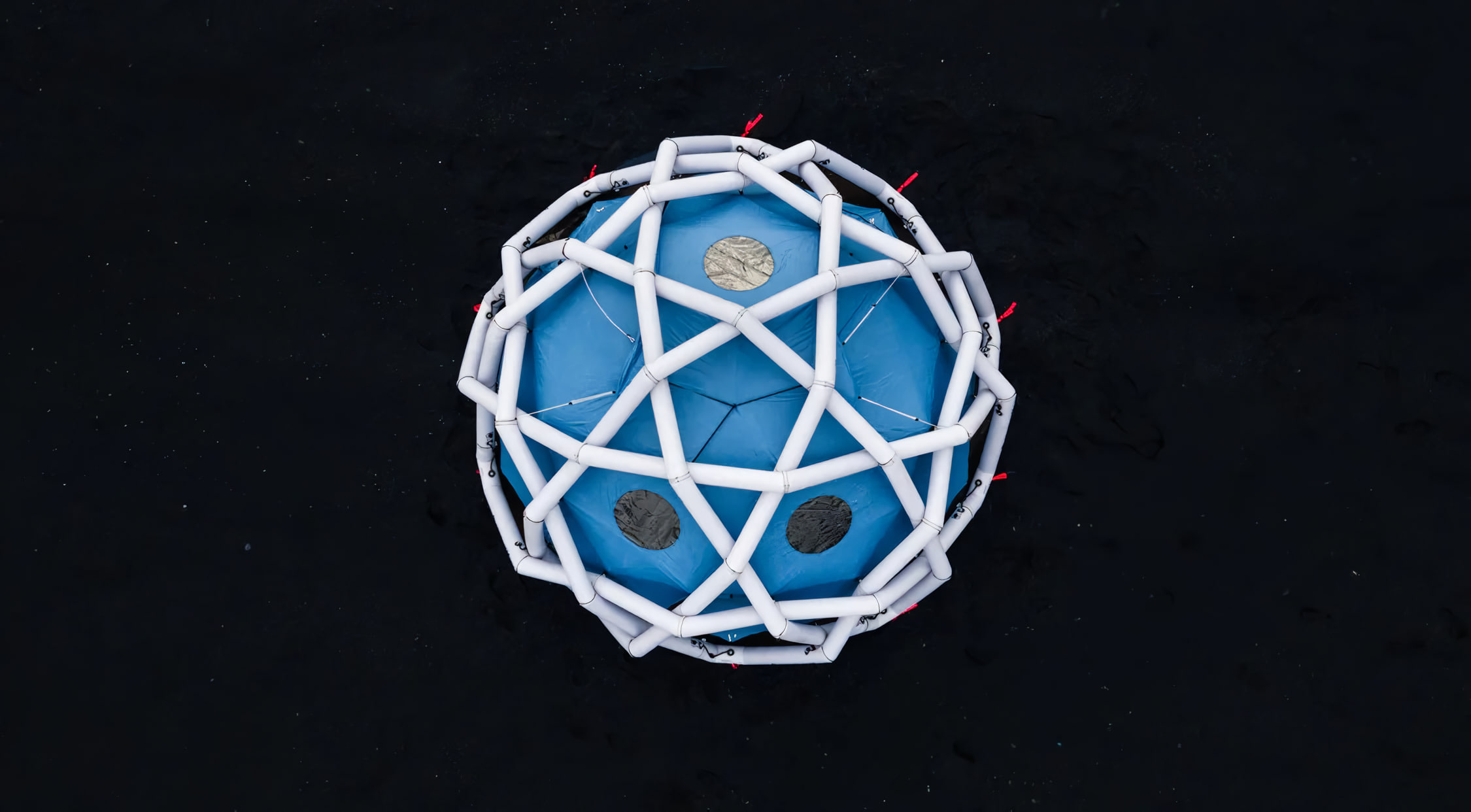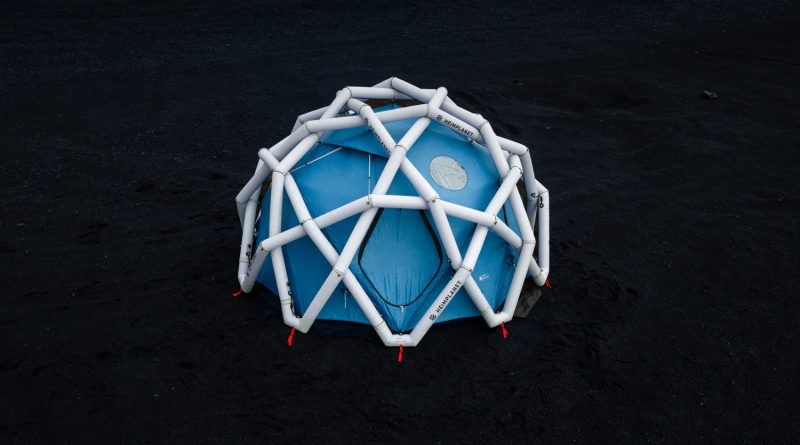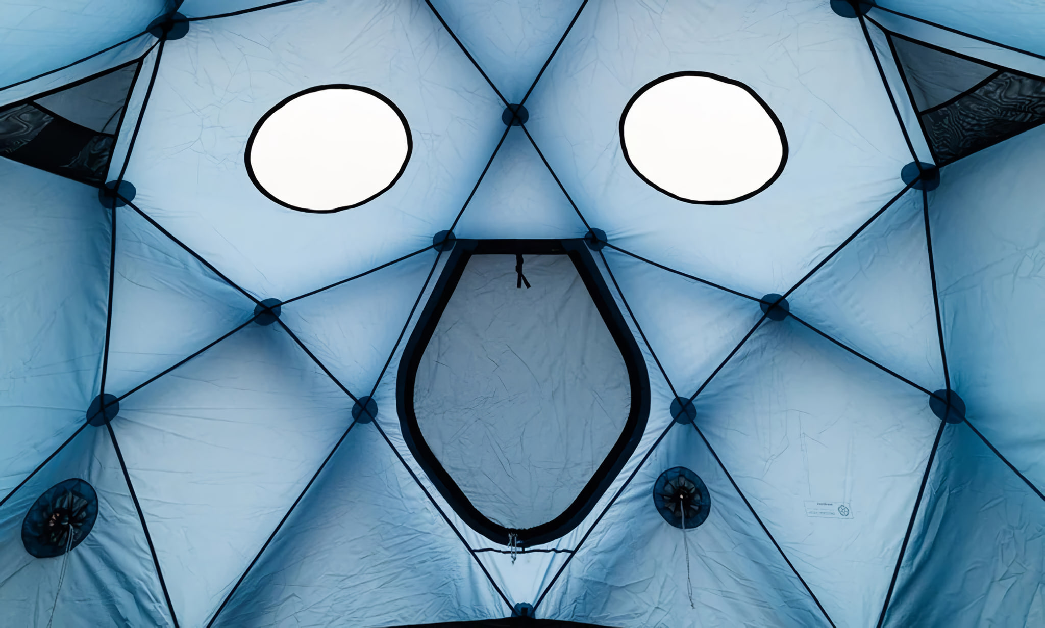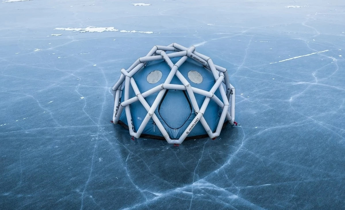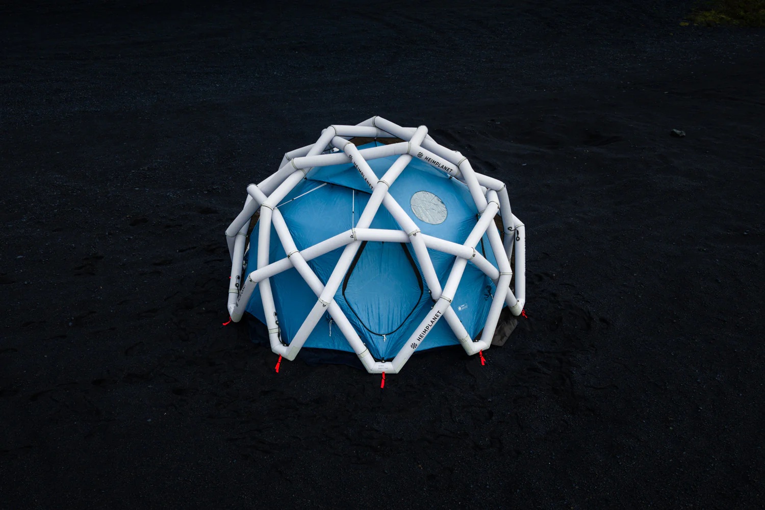 Heimplanet Blue Ice изготовлена из сверхплотной ткани с экзокаркасом из надувных трубок, которые можно накачать за 5-10 мин. Также обещают продуманную вентиляцию и отвод влаги. В высоту она 234 см, площадь пола — 13.2 м², вес — 25 кг.