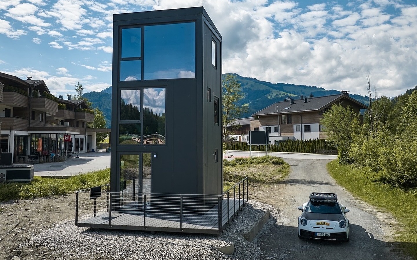 У трёхэтажной капсулы стальной каркас с алюминиевой облицовкой размером 4 x 4.2 x 8.6 м, а внутри — гостиная, кухня, два санузла и две спальни общей площадью 39 м².