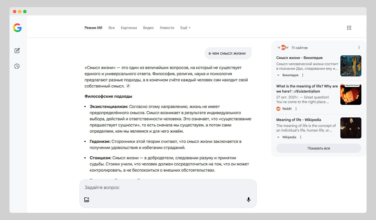 В Google-поиске для России появился «Режим ИИ» — это умный чат-бот, который может ответить на любые вопросы.